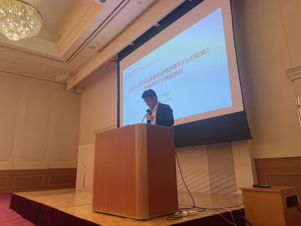 続いて、第1期公募班から3名の先生にご登壇いただきました。まず、岩田浩明先生(鳥取大学)より「AIによる医薬品候補化合物評価モデルの開発と共同研究での検証検討」と題し、マルチタスク学習を用いた標的タンパク質予測AIやADME予測AIの実例をご紹介いただきました。